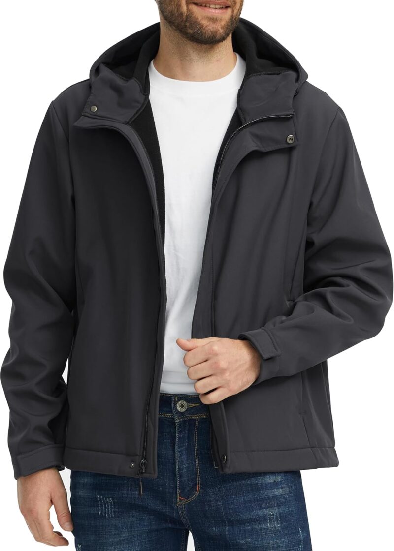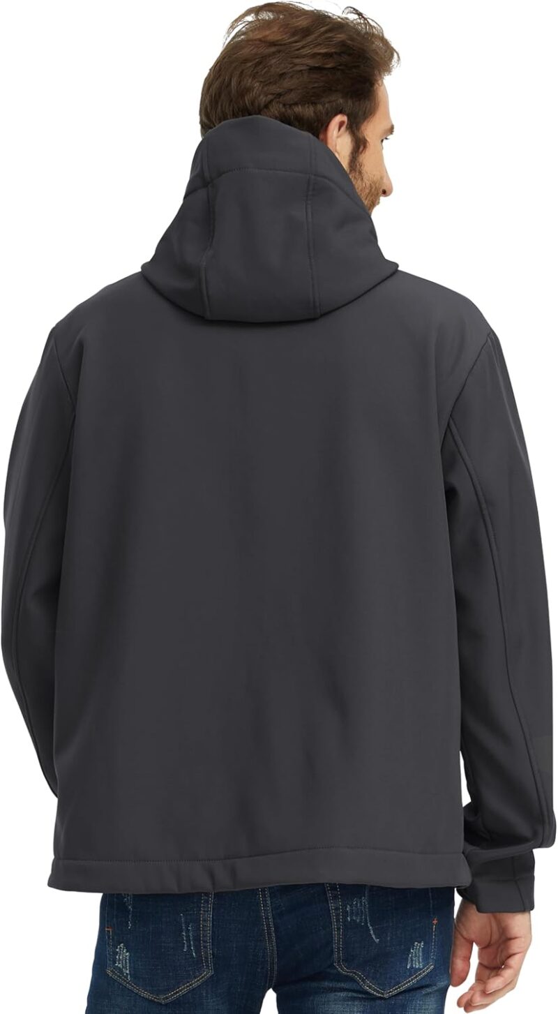 Softshell Jacket for Men: 1) Attached hood & hooded drawstrings. 2) Stand collar & elastic cuffs. 3) Classic fit design.