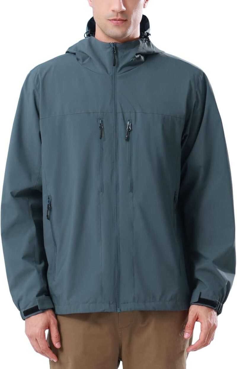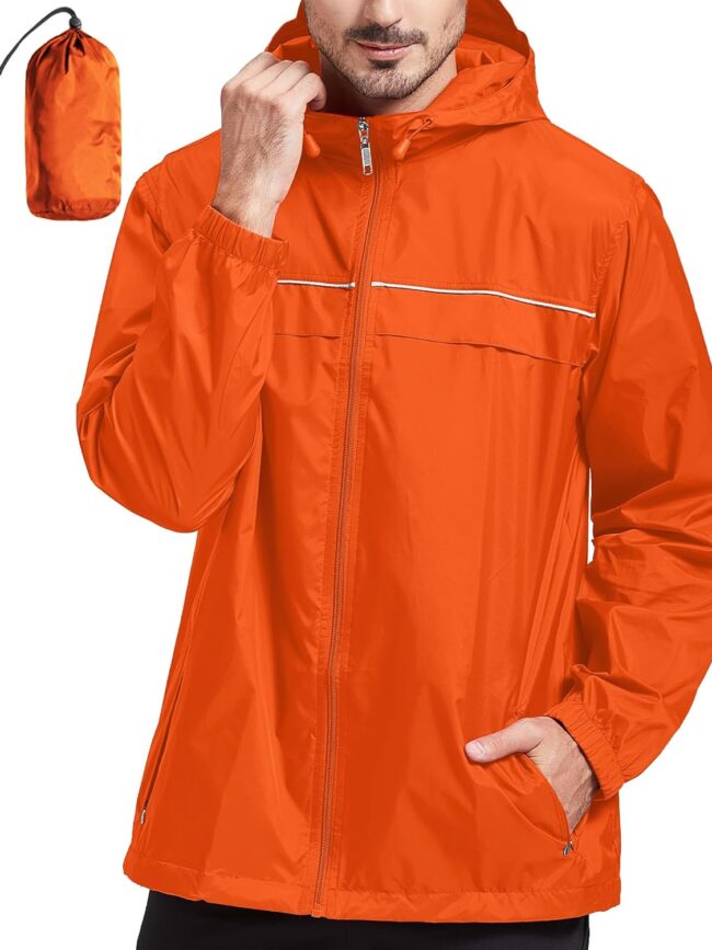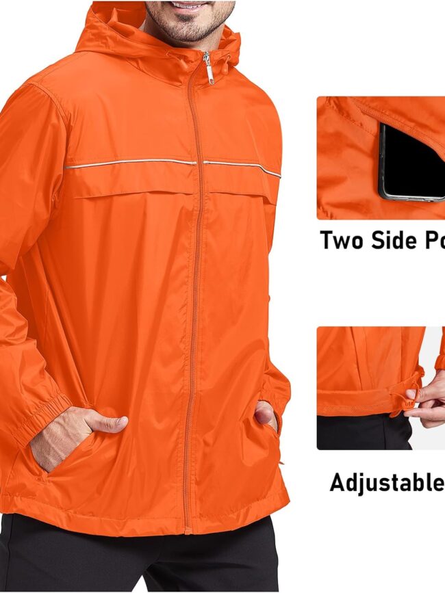 5 FUNCTIONAL UTILITY POCKETS: This lightweight rain jacket for men comes with 2 side zipper pockets, 2 breast-pocket, and 1 inner pocket for keeping tools, cell phone or cash, keeping your personal belongings safe during outdoor activities.
